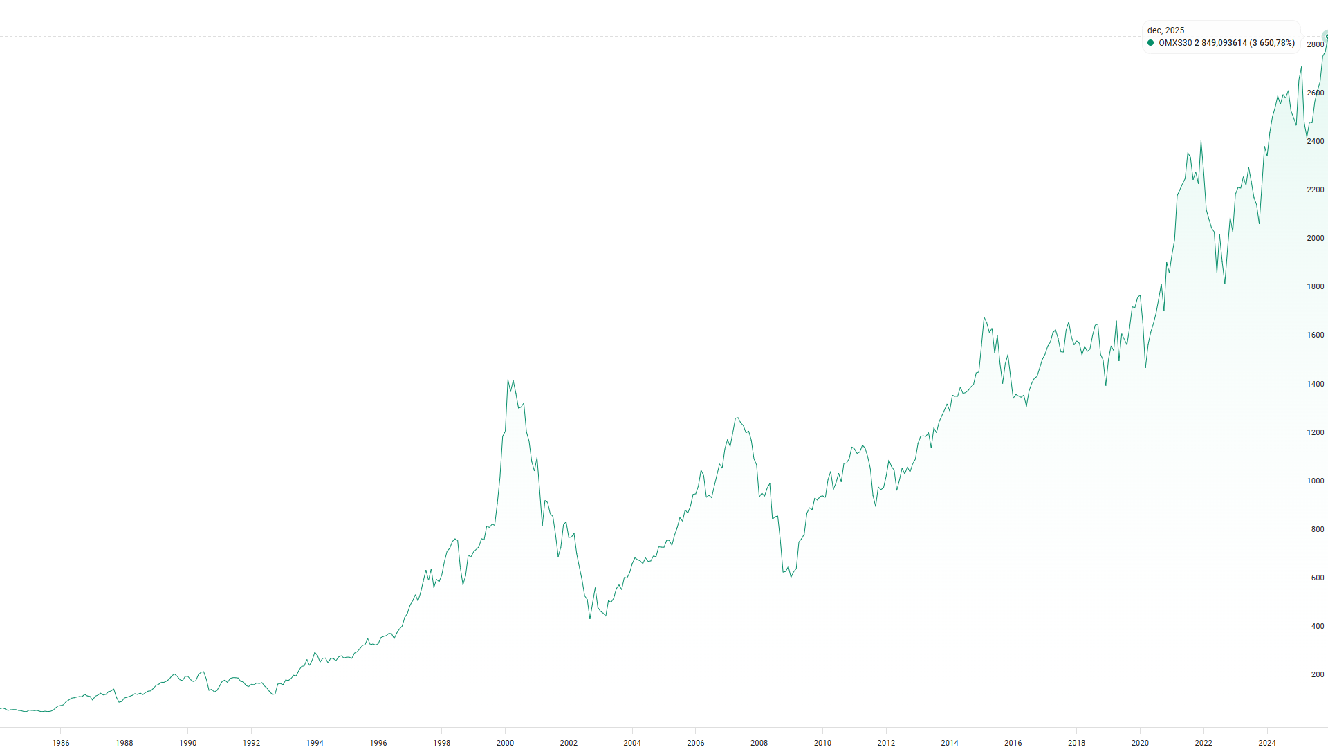 Börsen och OMXS30 har över tid gett mycket god avkastning för den som följt med i indexets utveckling. Med en årlig avkastning på omkring 7% innebär det att investerat kapital dubblas i värde vart 10:e år. Denna ränta-på-ränta effekt ger mycket stabil utveckling över tid.